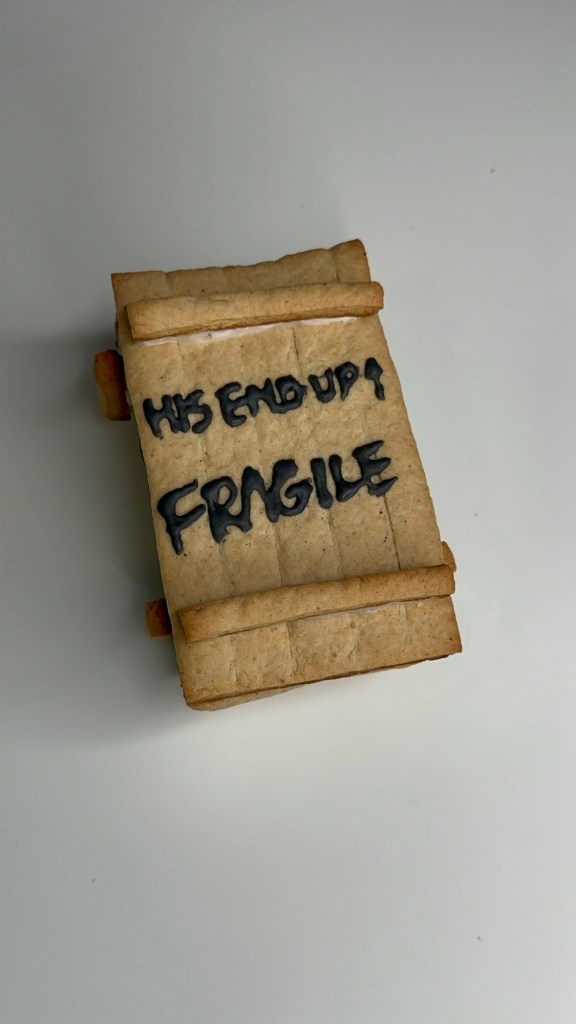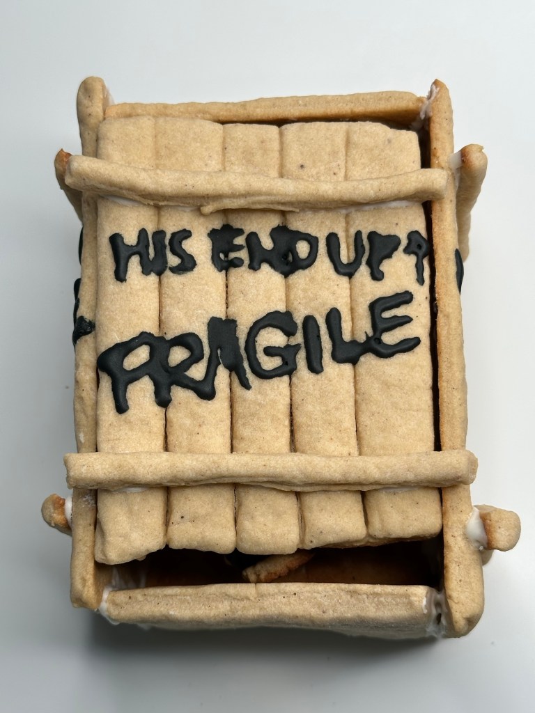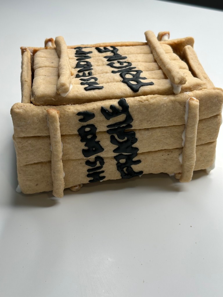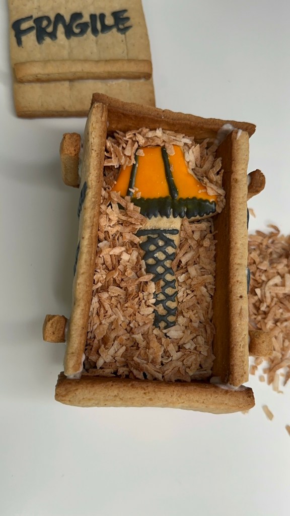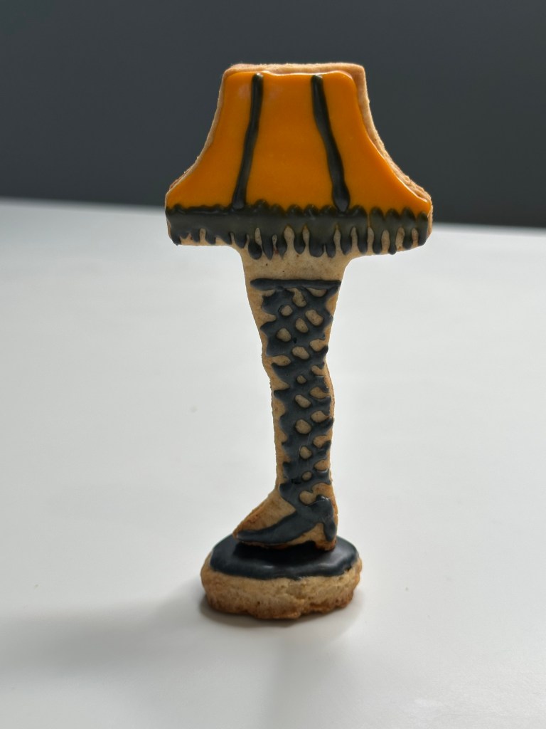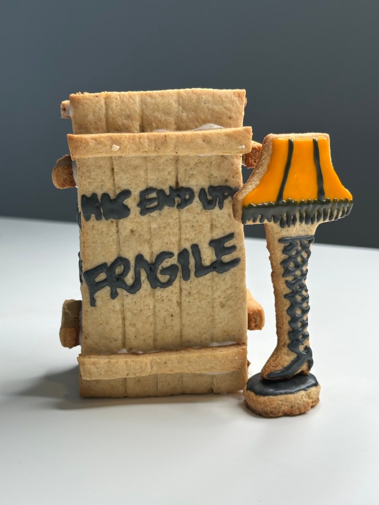 Before starting, I put together a blueprint with measurements. The plan is to build the iconic leg lamp and its crate. The project took me approximately two days to complete. That included making the cookie dough, chilling and assembling the dough, icing the designs, and gluing the pieces together. It is possible that you can get it done in a day. I couldn’t because I had to work on the project between running errands, doing chores, making meals, and accompanying my toddler.