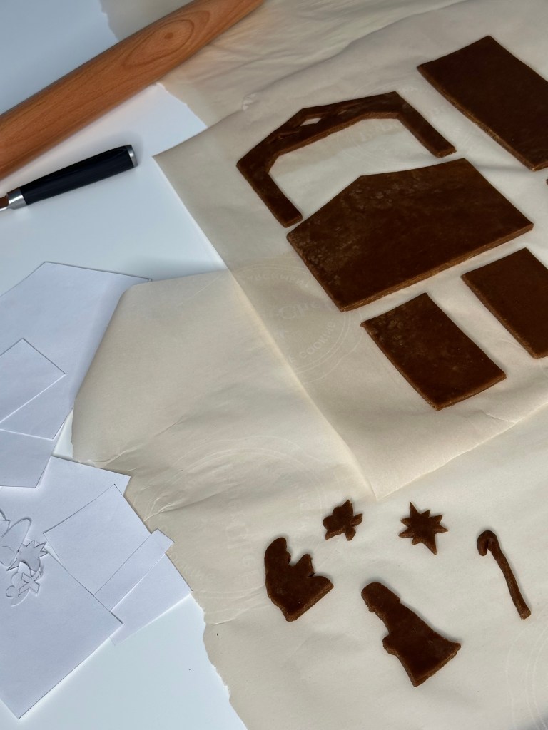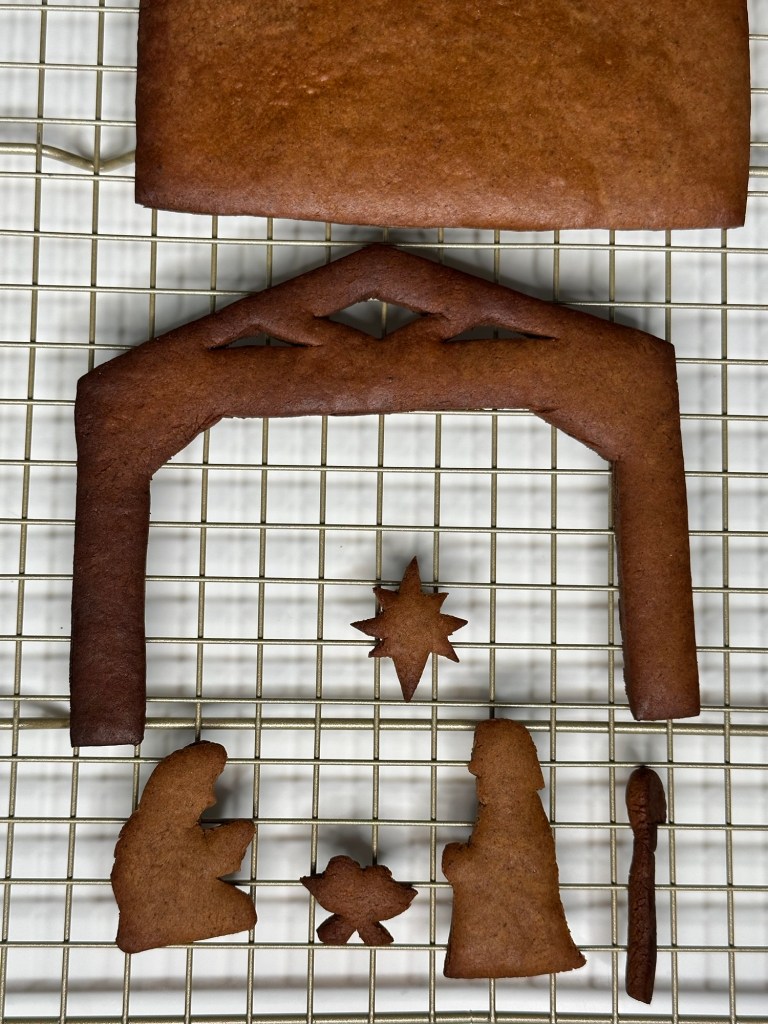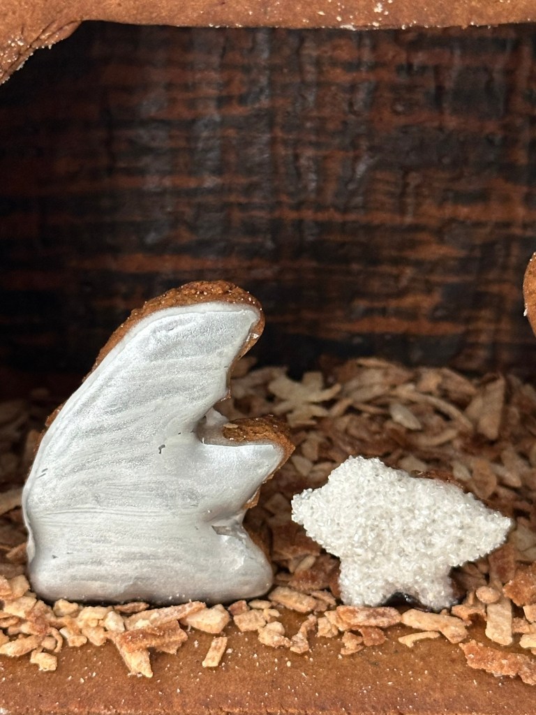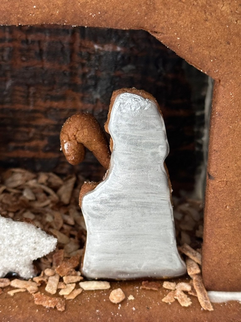 Learning from my mistakes from last project, I made sure that measurements are precise this time. I wanted Baby Jesus to stand out so I added white sanding sugar on the figure. With Mother Mary and Joseph, I kept them simple by flooding with royal icing and painting them in silver afterwards. I sprayed gold dust on Star of Bethlehem to represent it is shining in the sky.